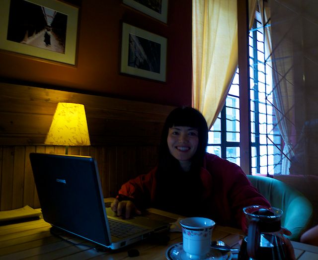 Tu es belle, et c’est sûrement pour ça que j’ai voulu te photographier. Tu venais de passer du temps avec un américain la cinquantaine grisonnante et bavarde, qui te parlait esthétique. On est dans un café à MoGanShan Lu, où des galeries d’art ont pris place dans des entrepôts. Toi tu l’écoutais un peu distraitement, en regardant de temps en temps ton i-phone. Et puis il est parti, et tu t’es mise à chatter. C’était visible à ton sourire devant l’écran, et à tes mains sur le clavier. Lorsque je t’ai demandé de te photographier, tu m’as dit « Because I’m Chinese ? ». Oui. Mais aussi shanghaienne, avec la réputation qui te précède : femme de tête, capricieuse, revendicatrice, élégante… que faire des réputations ? Et voici le rire sur tes lèvres.