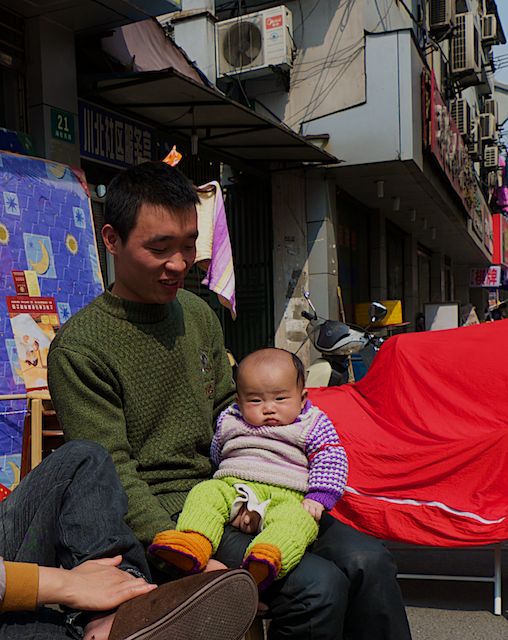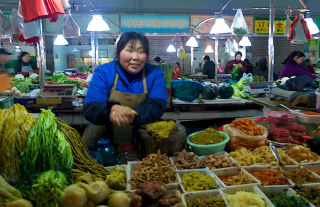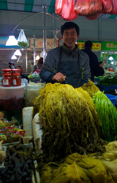 En tout cas, vous ne voyez pas souvent d’occidentaux. Et ça vous fait bien rire d’en voir une s’étonner devant n’importe quoi. Ces légumes en premier plan, par exemple, luisants et rosâtres. Et qu’elle les prenne en photo, puisqu’elle veut – de toute façon ça ne perturbe pas le travail : épluchage, écossage, équeutage… Et toi, la femme devant les condiments, le piment de la vie ça te connaît. C’est toi qui demandes la photo… mais pour le voisin (le cousin, le fils, le neveu… ). Il éclate de rire. Non, c’est pour elle ! Alors les deux, voilà. Xie xie !
