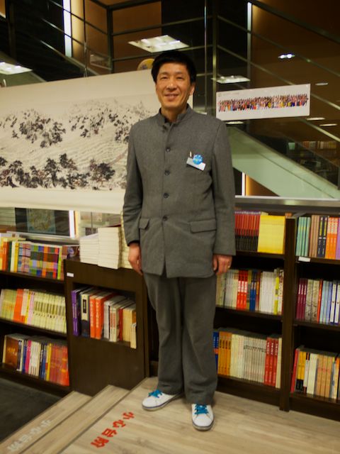 Ton travail c’est peut-être de rappeler aux acheteurs qu’il faut payer l’ouvrage choisi à l’étage où il a été trouvé, ou bien de leur montrer où sont les escaliers, au cas où ils ne s’en souviendraient pas. Vous êtes de milliers de salariés dans cette fonction, à Shanghai : ouvreurs de porte, serveurs de verre, changeurs d’assiettes, indicateurs de direction, appeleurs d’ascenseurs… Mais des clients, il n’y en pas, ou très peu. Et ceux qui sont là paraissent savoir où ils vont et connaissent les règles du lieu. Alors tu erres dans les rayons. Visiblement, c’est l’ennui. J’erre aussi. Parce qu’il faut bien dire que se retrouver dans une librairie où tout est en chinois, c’est un peu déroutant… On est aveugle avec des yeux. Comme nous errons tous les deux, je te propose une photo. Et là, grand sourire immédiat. Mais qui s’éteint un peu au moment du déclic.
