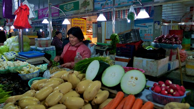 Votre vie comment l’imaginer ? Je me dis que vous vous êtes levés très tôt, que c’est vous qui avez tout fait pousser, tout préparé ce qu’il y a sur votre stand. Oui, mais où ? Dans la périphérie proche de Shanghai, quelque part dans ces zones qu’on ne peut appeler ni ville ni campagne – toutes petites exploitations, familiales. Sûrement que vous n’avez pas le statut de shanghaïens : votre hukou est ailleurs. Le marché est sous un échangeur routier, tout près de la gare aussi. Vous avez pu venir en train, et c’est le plus vraisemblable.