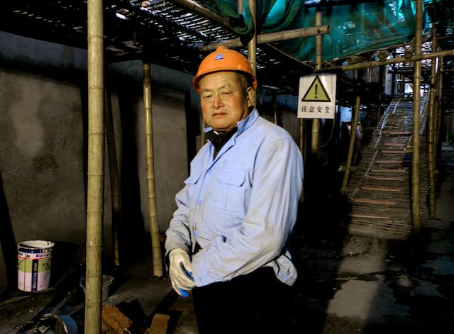 Il y a cet ouvrier, qui est apparu dans la ruelle quand tu montais sur la rampe d’un échafaudage en bambous, pour voir. Et pourtant tu avais regardé avant de te décider. Bien sûr qu’il y avait du mortier frais, et une pelle dedans, et un sceau à côté. Dans ses yeux, pas un étonnement, pas une réprobation, pas un amusement. Tu es descendue, et vous avez marché dans le même sens, lui le long de la rampe, toi la descendant. Il regardait ton appareil photo. En bas tous les deux, il continuait à regarder l’appareil. Alors tu lui as demandé s’il voulait que tu le prennes en photo. Il a hoché la tête, s’est placé face à la lumière de chantier. Et voilà. Et tu sais maintenant pourquoi tu étais là.