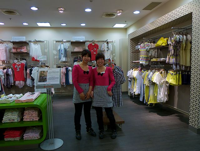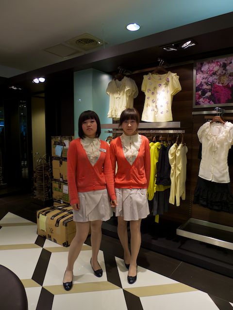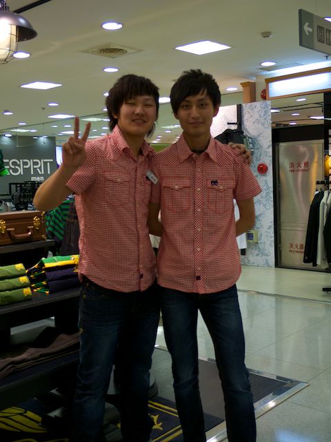 Disons que nous sommes aux Galeries Lafayette, on y trouve les mêmes marques, les mêmes espaces, les mêmes produits… Comme dans les grandes avenues de Shanghai, d’ailleurs, Mango, Sephora, H&M, Esprit, Zara, Piaget, Calvin Klein… Et comme c’est tout ce qu’on sait lire au milieu des caractères ou de leurs retranscriptions, la distinction capitaliste se fait plus prégnante. Mais vous êtes là, les vendeurs qui allez par paires.