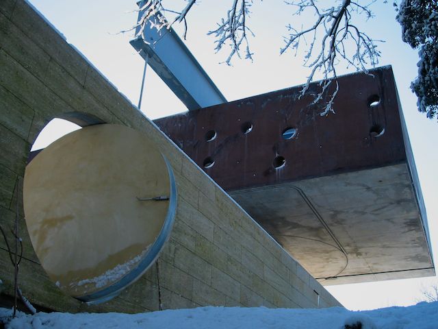 […] une opposition devenue traditionnelle dans l’architecture contemporaine (que l’on songe à la maison Lemoine de Rem Koolhaas), mais au lieu de cela, le béton lissé semble aplati à la spatule et le surplomb […]